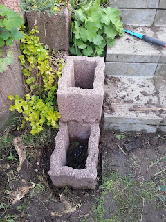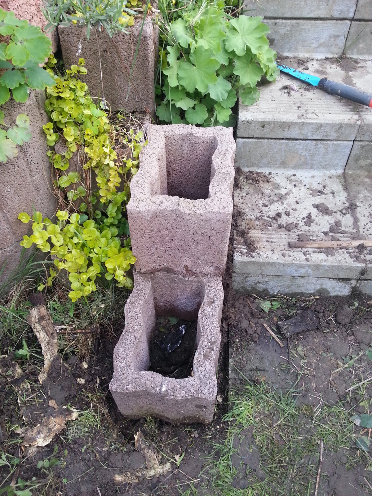 Endlich das Stück neben der Treppen entunkrautet und...ratet...Erde geschüppt.